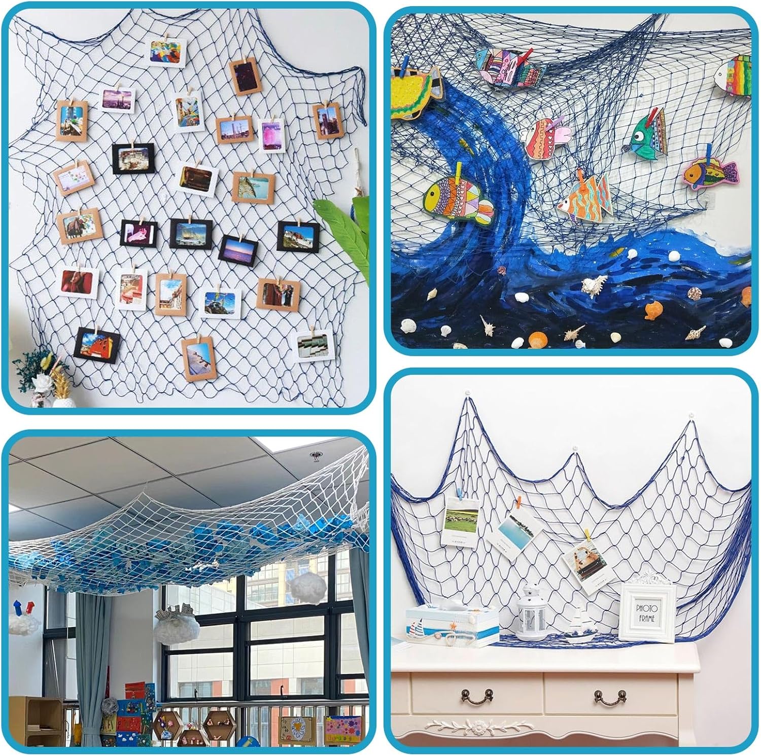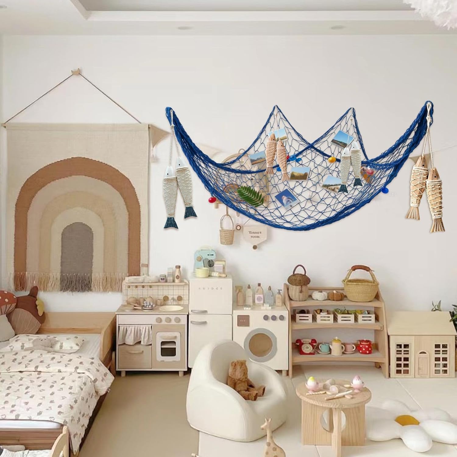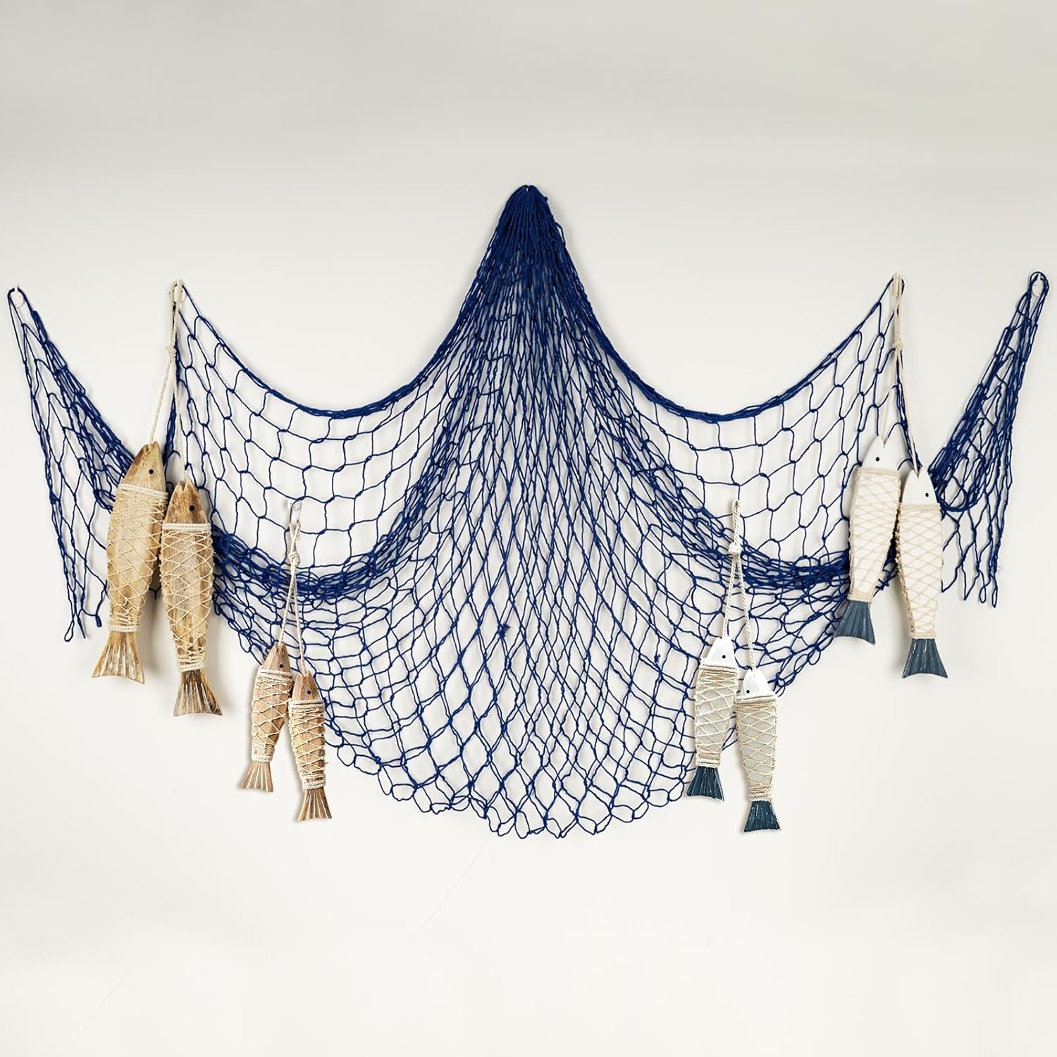 8 Pack Hand Carved Antique Wood Fish Sculpture Decor Ornament with Fishnet, Wooden Nautical Beach Theme Wall Art Hanging Fishing Net Decorations for DIY Party, Lake House, Bathroom Bedroom Blue