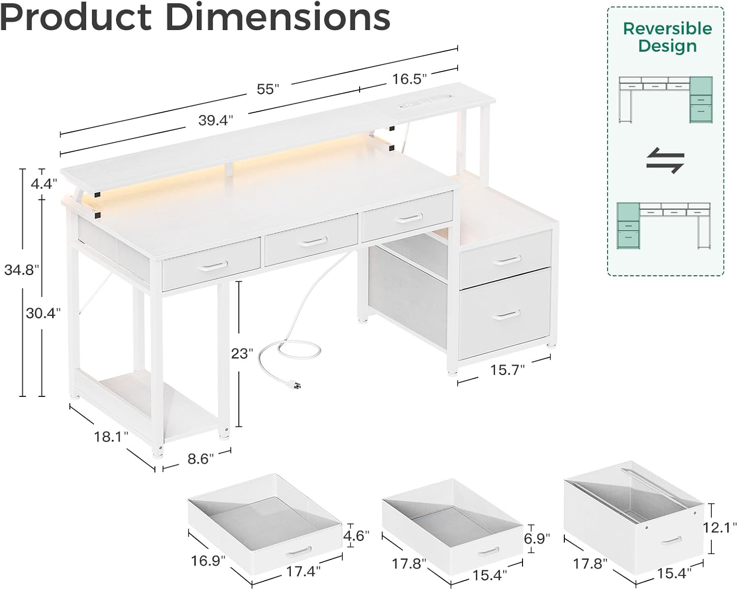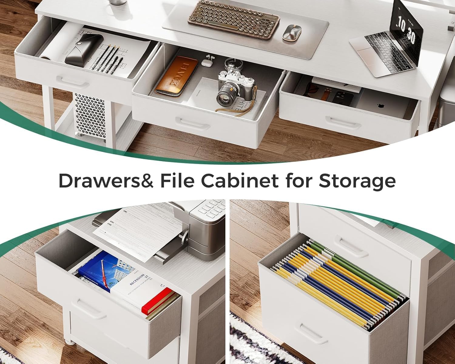 AODK 55 Inch Computer Desk with 3 Drawers and File Cabinet for Storage, Office Desk with Monitor Stand and LED Lights, Home Office Desks, White