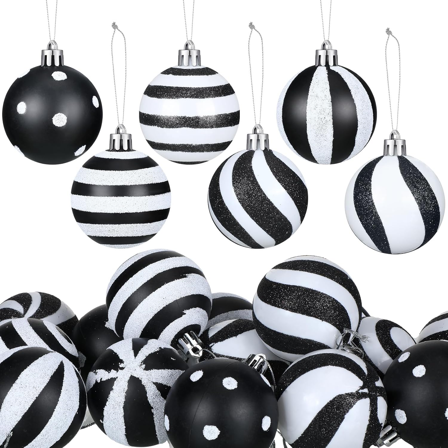 Riceshoot 24 Pcs Christmas Black and White Ball Ornaments Xmas Plastic Stripe Dot Hanging Ball for Christmas Tree Party Decoration Supplies(3.15 Inch)